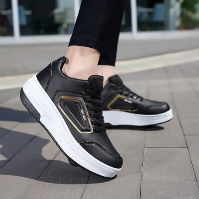 Кеды во съемными роликами  3 в 1: Могут использоваться как двухколесные ботинки, одноколесные ботинки (снимите переднее колесо и добавьте чехол) или плоские кроссовки (удерживайте кнопку за ботинками, чтобы уменьшить заднее колесо и снять переднее колесо).